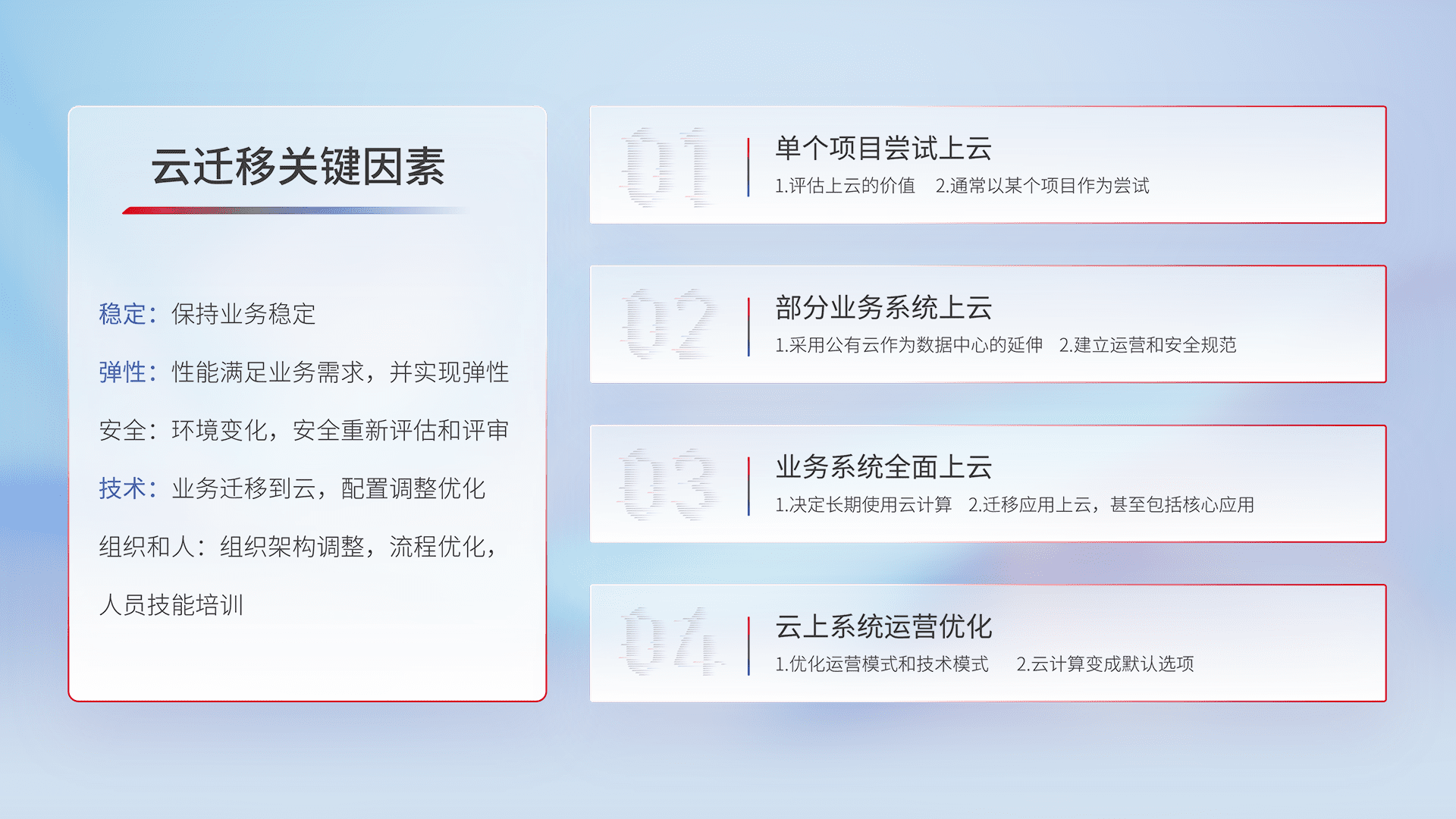 结合实际业务,,从规划设计、、、云平台选型、、、、云原生改造、、、、数据迁移、、集成交付,,,迁移全过程为客户识别最佳上云路径,,,,做好风险识别管理,,,设计网络架构、、、身份权限、、、安全审计合规、、操作审计、、日志审计、、监控告警策略、、、多站点容灾设计等,,对云上基础设施进行整体规划,,,提升IT治理水平,,,,以满足弹性、、、、高可用、、高性能的需求。。。。