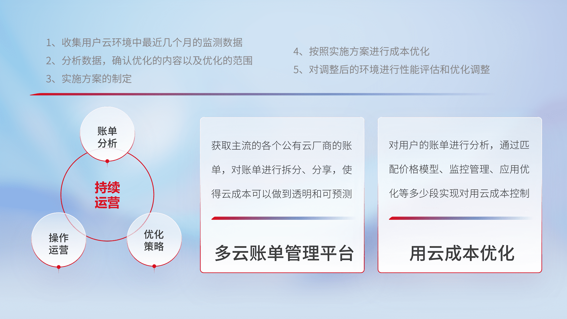 通过多云纳管,,以统一的资源数据模型把客户的云资源进行抽象和封装,,,进而实现对多云资源的统一操作,,保障云资源管理的可靠性、、稳定性与可用性。。量身定制化运维内容,,,,配置、、、、开发运维、、补丁管理、、备份、、监控、、、、认证和访问管理、、、审计和日常巡检等,,保障在用云过程中的可靠度,,稳定度以及高可用率。。。