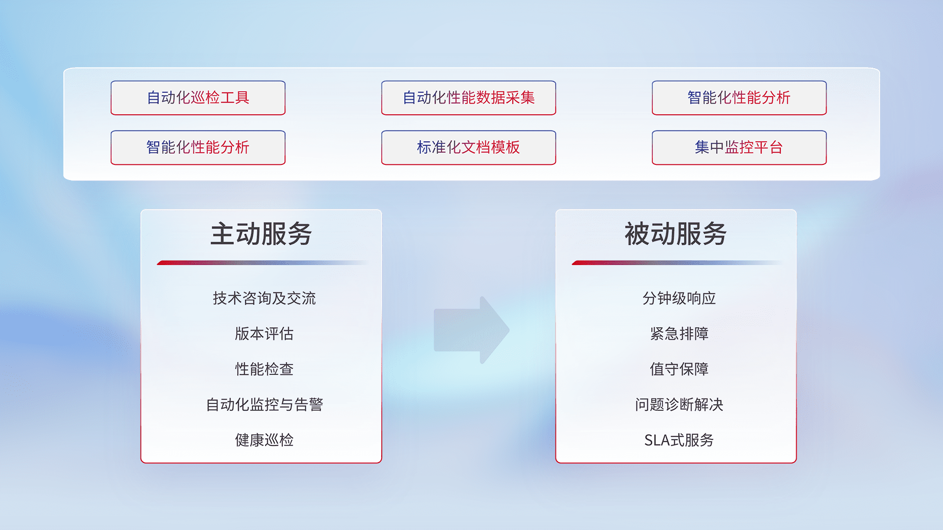 智能化工具和标准化文档,,保障服务质量,,,,提供主动服务(包含技术咨询、、版本评估、、性能检查、、、自动化监控与告警、、健康巡检)和被动服务包含(分钟级响应、、紧急排障、、、值守保障、、问题诊断解决、、SLA服务)。。。